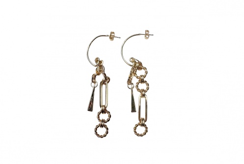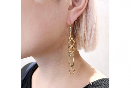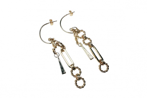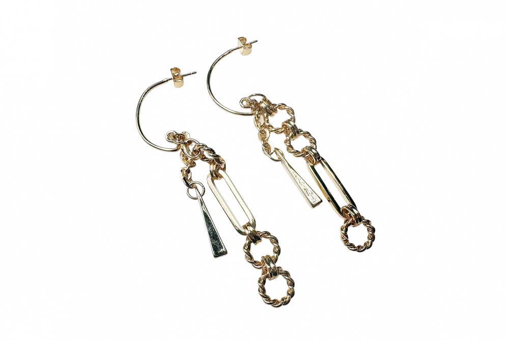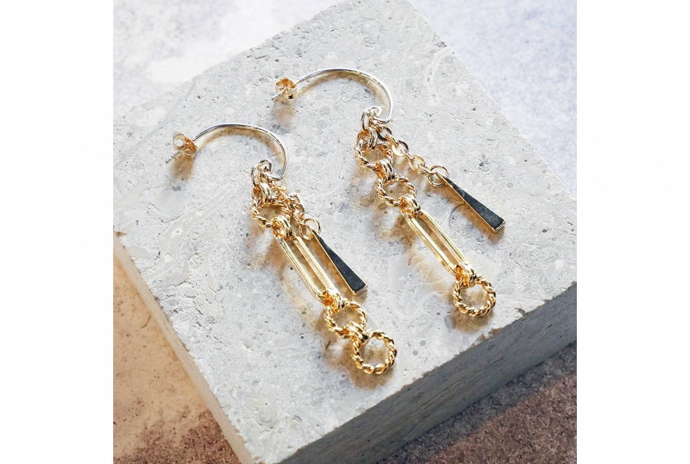 パーツの長さや組み合わせにこだわったamplisらしい個性派ピアスです。どんなスタイリングにも合わせやすい万能デザインで、縦長シルエットなので顔周りがスッキリした印象を与えてくれます。