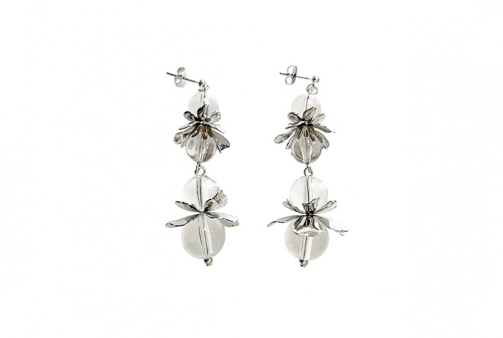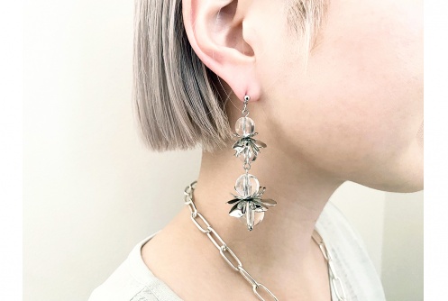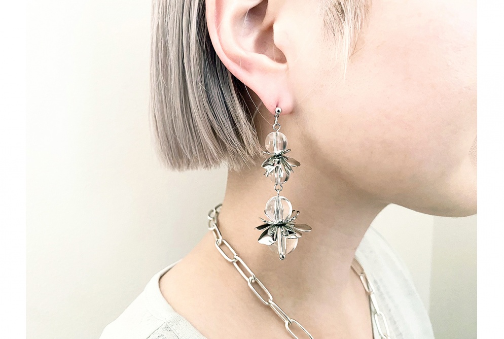 花モチーフとクリアが連なった大人デザインのピアスです。デザイン性が高いので、クリアでもカジュアルになりすぎずに大人っぽい雰囲気にしてくれます。